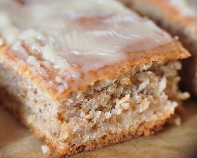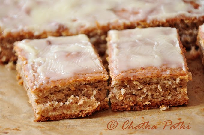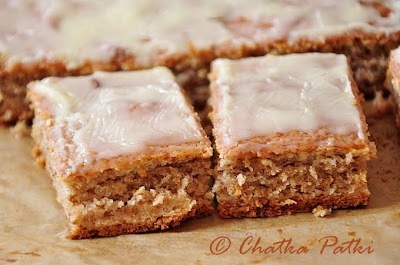 W czasie pieczenia zniewala unoszący się w powietrzu zapach pieczonych bananów. Monotonię ciasta przełamałam białą polewą – pół tabliczki rozpuszczonej białej czekolady zmieszałam z 3 łyżeczkami kremówki.