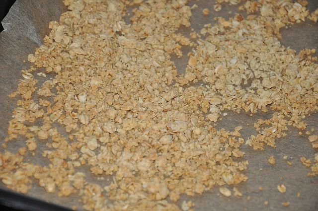 Piekarnik nagrzać do 180 stopni (góra-dół). Wstawić blachę z okruszkami i lekko je zrumienić przez około 10 minut. W trakcie  – raz czy dwa przemieszać je drewniana łopatką. Wyjąć blachę z kruszonką, wstawić blachę ze spodem – piec około 15 minut. Wyjąć z piekarnika.