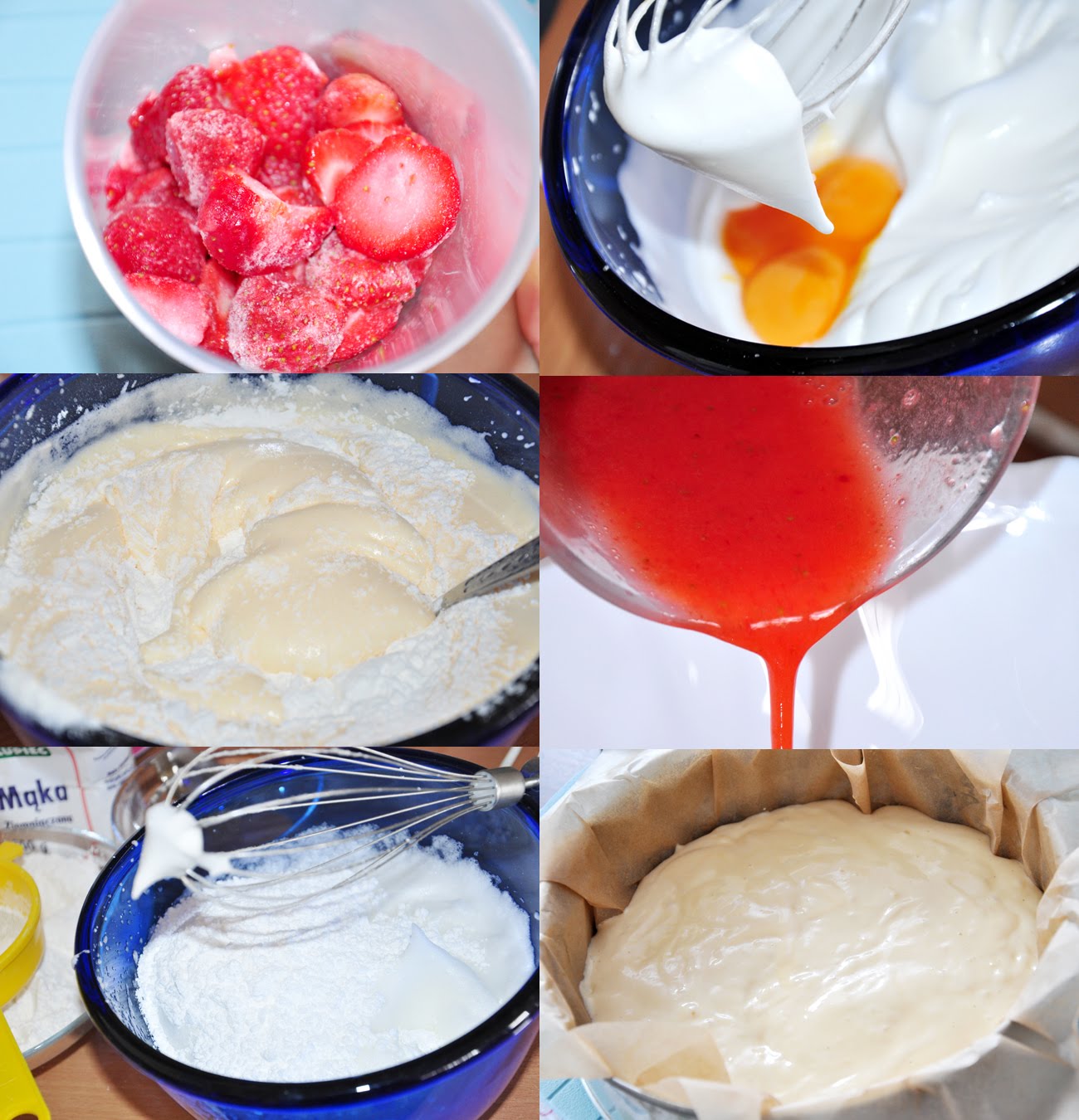 Białka ubić. Nadal ubijając dodać cukier puder a następnie żółtka. Do masy wsypać oba rodzaje mąki połączone z proszkiem do pieczenia i delikatnie wymieszać. Masę przełożyć do tortownicy wyłożonej papierem do pieczenia. Piec 30-40 min w nagrzanym do 170 stopni piekarniku. W trakcie pieczenia nie zaglądać do środka. Po upieczeniu uchylić drzwiczki, ale ciasto wyjąć z piekarnika dopiero po 5 minutach – żeby biszkopt nie opadł.