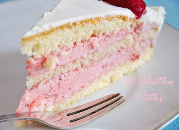 Biszkopt przełożyć masą truskawkową.