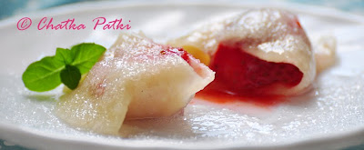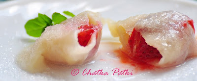Nakładać po 1 dużej truskawce, zlepiając dokładnie brzegi pieroga. Pierogi wrzucać na wrzącą, lekko osoloną wodę i gotować 4 minuty, od ponownego zagotowania się wody. Odsączyć, podawać polane roztopionym w rondelku masełkiem i posypane białym cukrem.