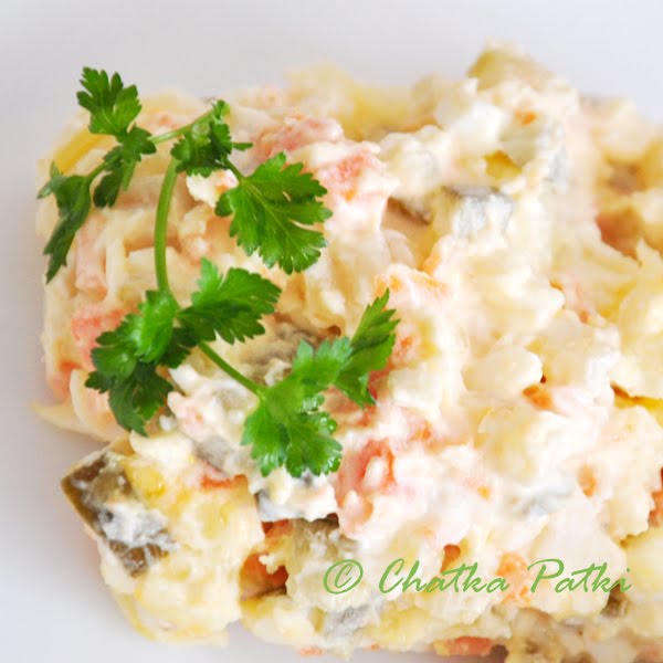 Doprawioną sałatkę przekładamy do czystego półmiska lub salaterki; dekorujemy majonezem, gałązką zielonej pietruszki.Podstawowej wersji dodaję, na wyraźne życzenie męża – jabłko. Przyznam się bez bicia, że nie jestem zwolenniczką tak podrasowanej wersji, zdecydowanie wolę zamiast jabłka dać np. odrobinę pokrojonego pora.
