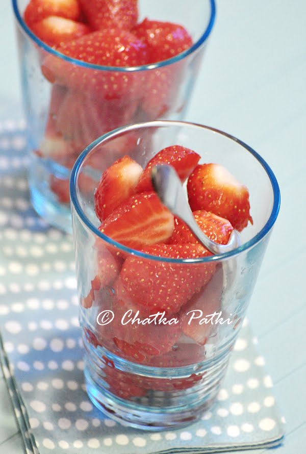 Wracając do truskawek – lubię najszybszą i najprostszą ich wersję – podzielone na połówki (lub na czworo) truskawki wrzucam do szerokiej szklanki, zasypując wszystko 2 łyżeczkami cukru. Ugniatam widelcem do uzyskania wspaniałego – słodkiego sosu 🙂