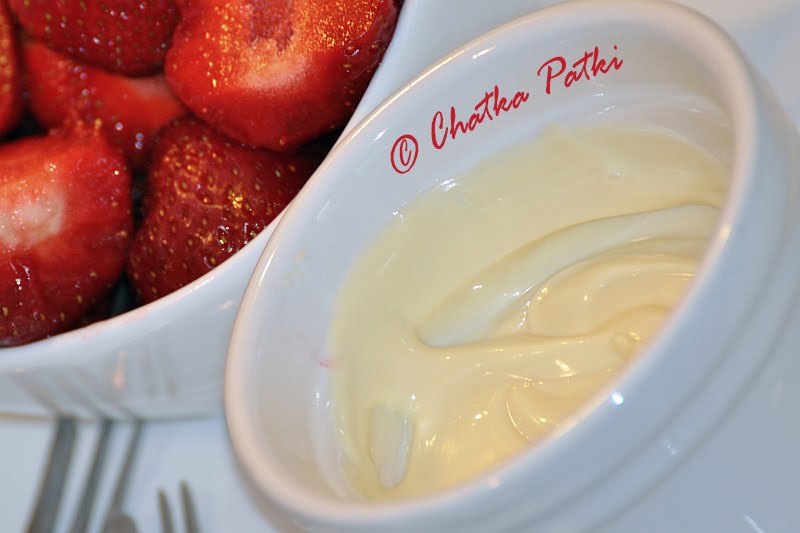 A dzieciakom do opłukanych i obranych z szypułek truskawek (tym razem w całości) roztapiam białą czekoladę. I szczerze – one uwielbiają to nasze domowe fondue.