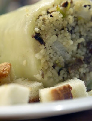 Obrane ze skóry pieczarki, umyć i zetrzeć na tarce o grubych oczkach. Na patelni rozgrzać 2 łyżki oleju – wrzucić starte pieczarki i smażyć je ok. 3 minuty, aż zaczną puszczać wodę. Do pieczarek dołożyć pół cebuli pokrojonej w kostkę – smażyć dalsze 3 minuty. Przełożyć do miseczki z kus-kusem. Wymieszać.
